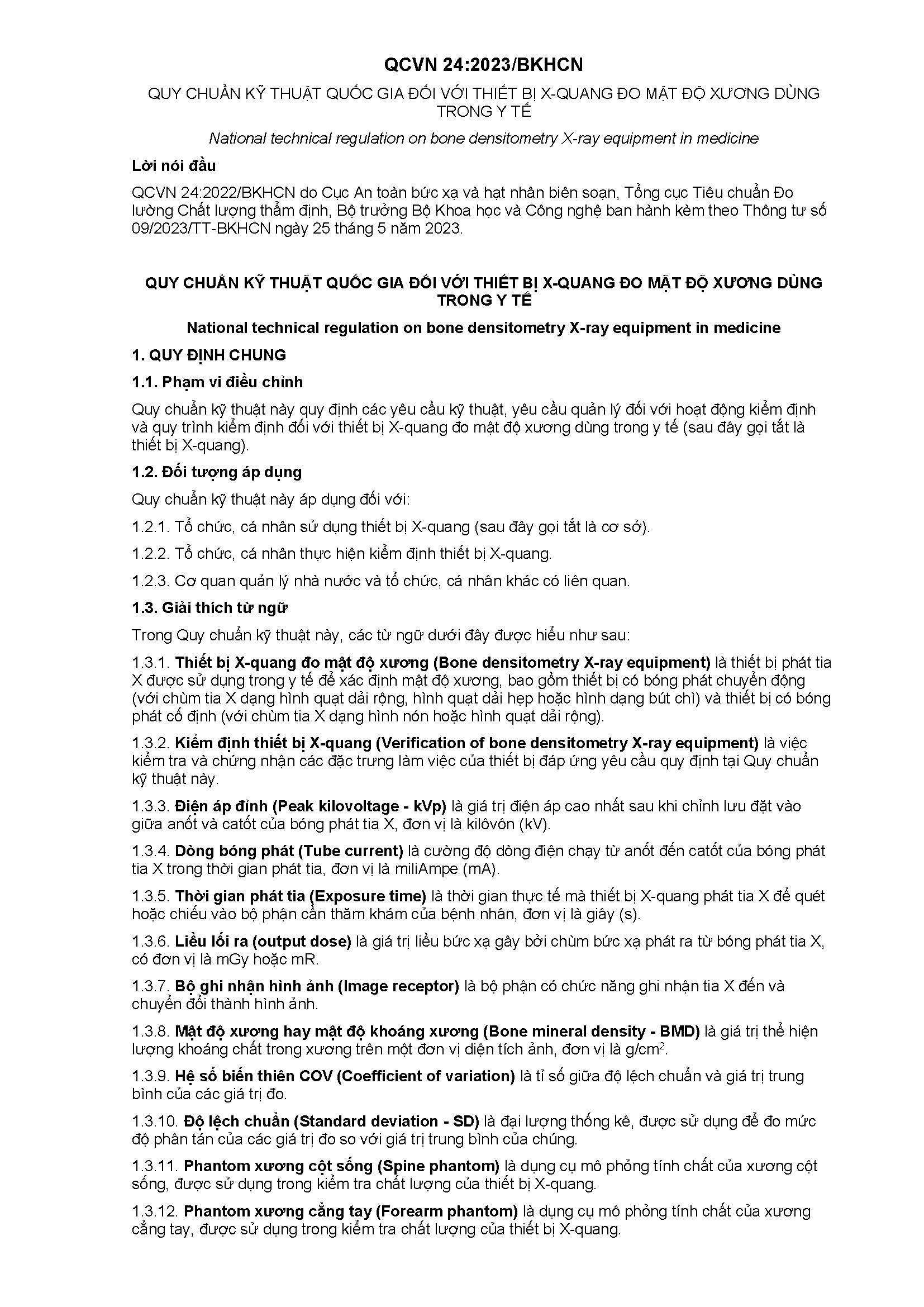 Quy chuẩn kỹ thuật quốc gia QCVN 24:2023/BKHCN về Thiết bị X-quang đo mật độ xương dùng trong y tế