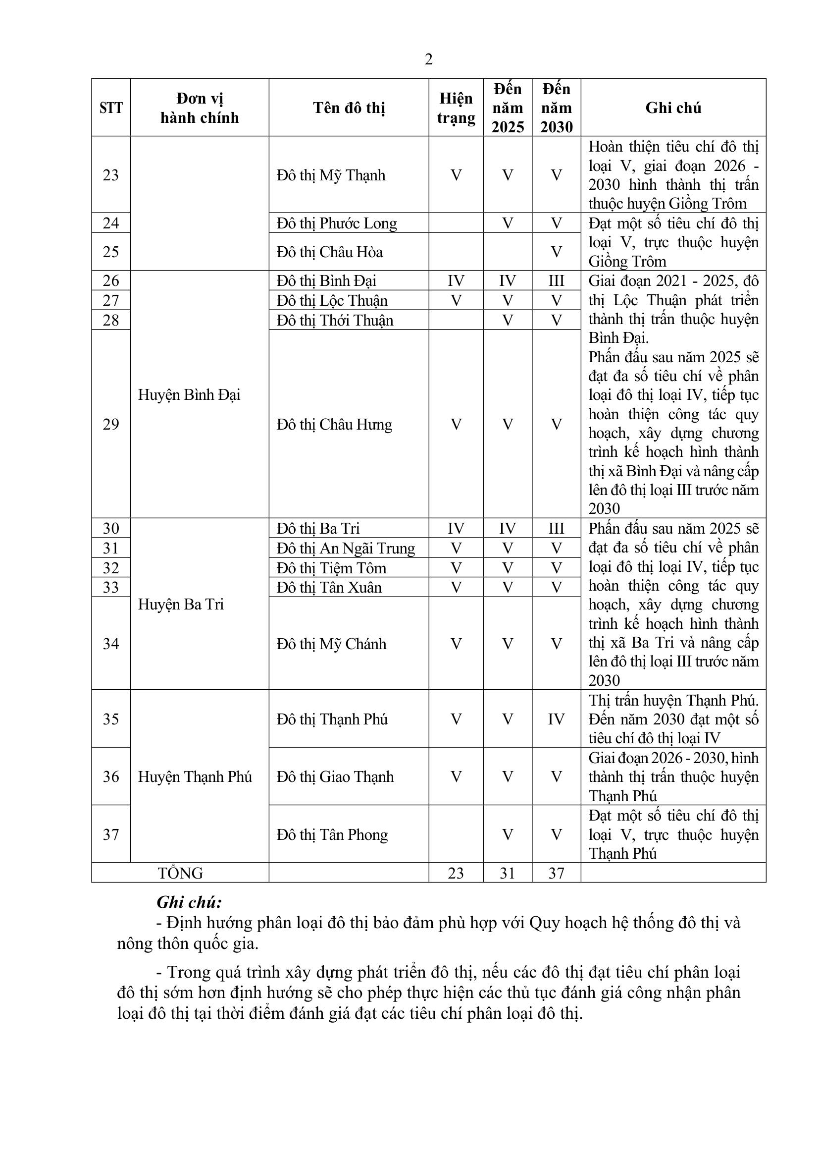 - 02 Hành lang phát triển theo hướng Bắc - Nam gồm: Hành lang kinh tế dọc theo quốc lộ 60, đường cao tốc CT33 và hành lang kinh tế dọc theo tuyến đường ven biển kết nối các đô thị ven biển thuộc 3 huyện (Bình Đại, Ba Tri và Thạnh Phú) và gắn kết nối khu vực ven biển các tỉnh Trà Vinh, Tiền Giang và Thành phố Hồ Chí Minh. Tập trung phát triển công nghiệp chế biến, chế tạo, năng lượng tái tạo, năng lượng sạch, dịch vụ logistics, cảng biển, du lịch sinh thái biển, phát triển các khu vui chơi giải trí cao cấp, sân golf, phát triển các đô thị xanh, thông minh.