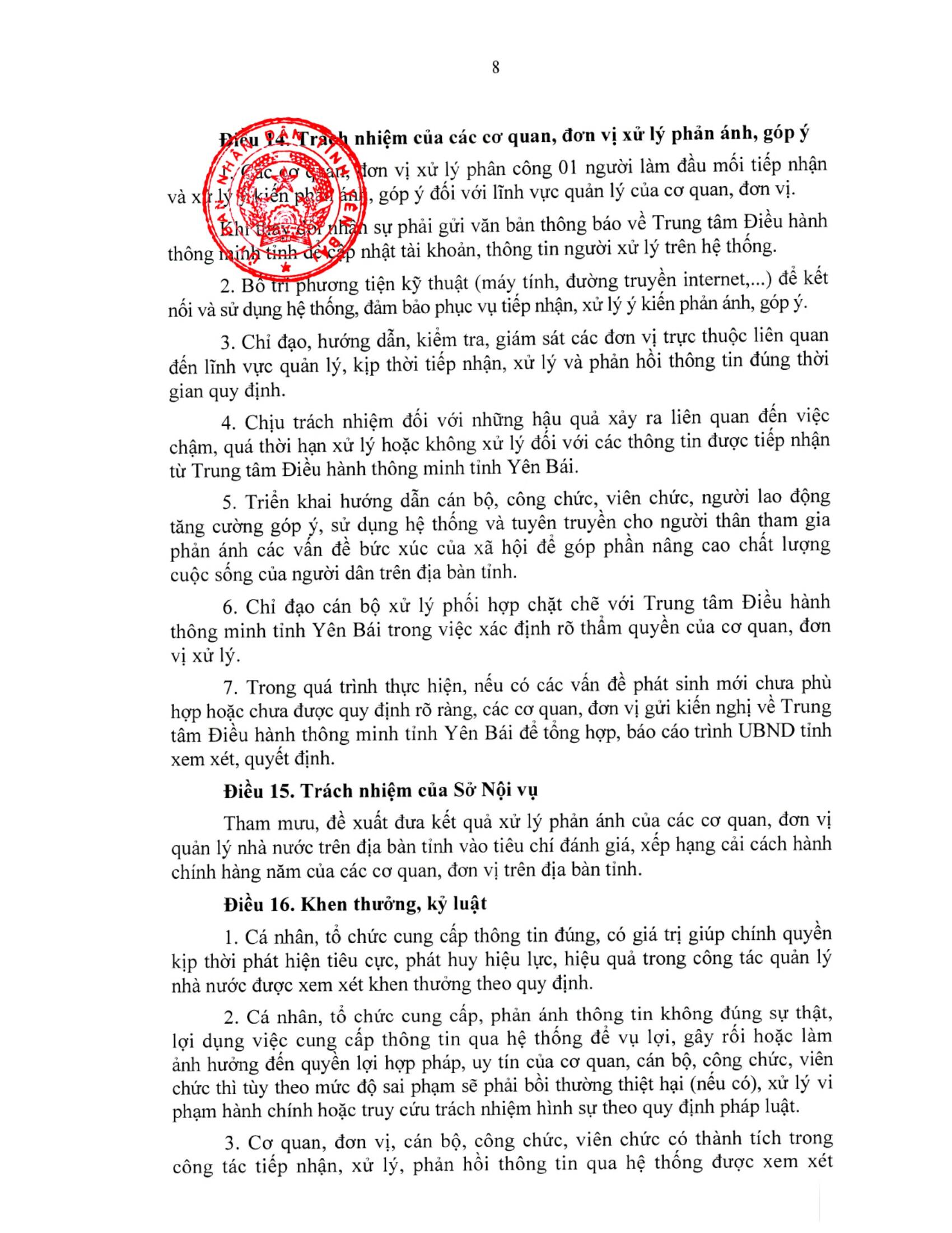 1. Cơ quan thực hiện việc tiếp nhận, xác minh thông tin phản ánh, góp ý là Trung tâm Điều hành thông minh tỉnh Yên Bái.