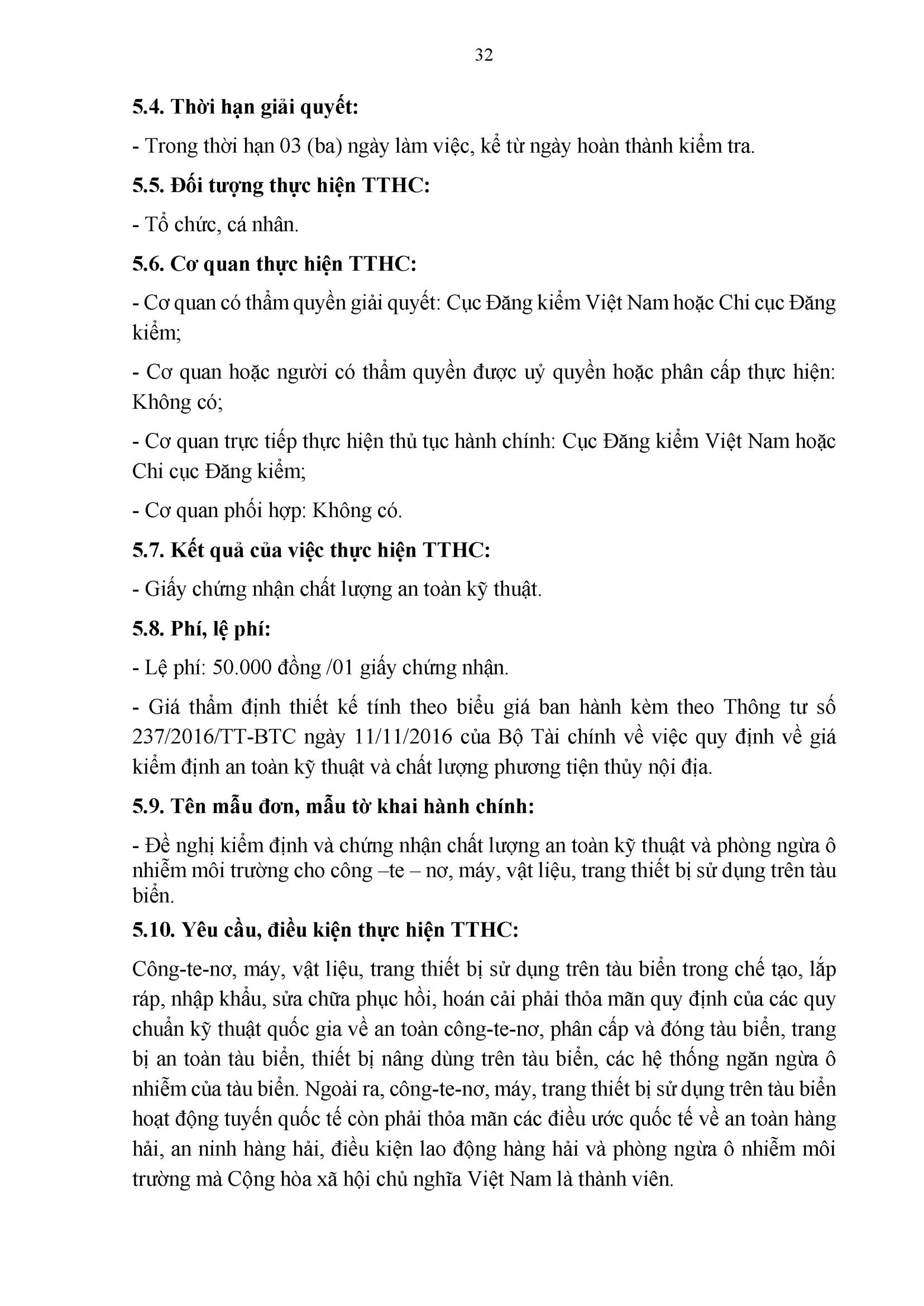 | 5 | 2.000009 | Kiểm định và chứng nhận chất lượng an toàn kỹ thuật và phòng ngừa ô nhiễm môi trường cho công-te-nơ, máy, vật liệu, trang thiết bị sử dụng cho tàu biển trong chế tạo, lắp ráp, nhập khẩu, sửa chữa phục hồi, hoán cải | Thông tư số 17/2023/TT-BGTVT | Đăng kiểm | Cục Đăng kiểm Việt Nam hoặc Chi cục đăng kiểm |