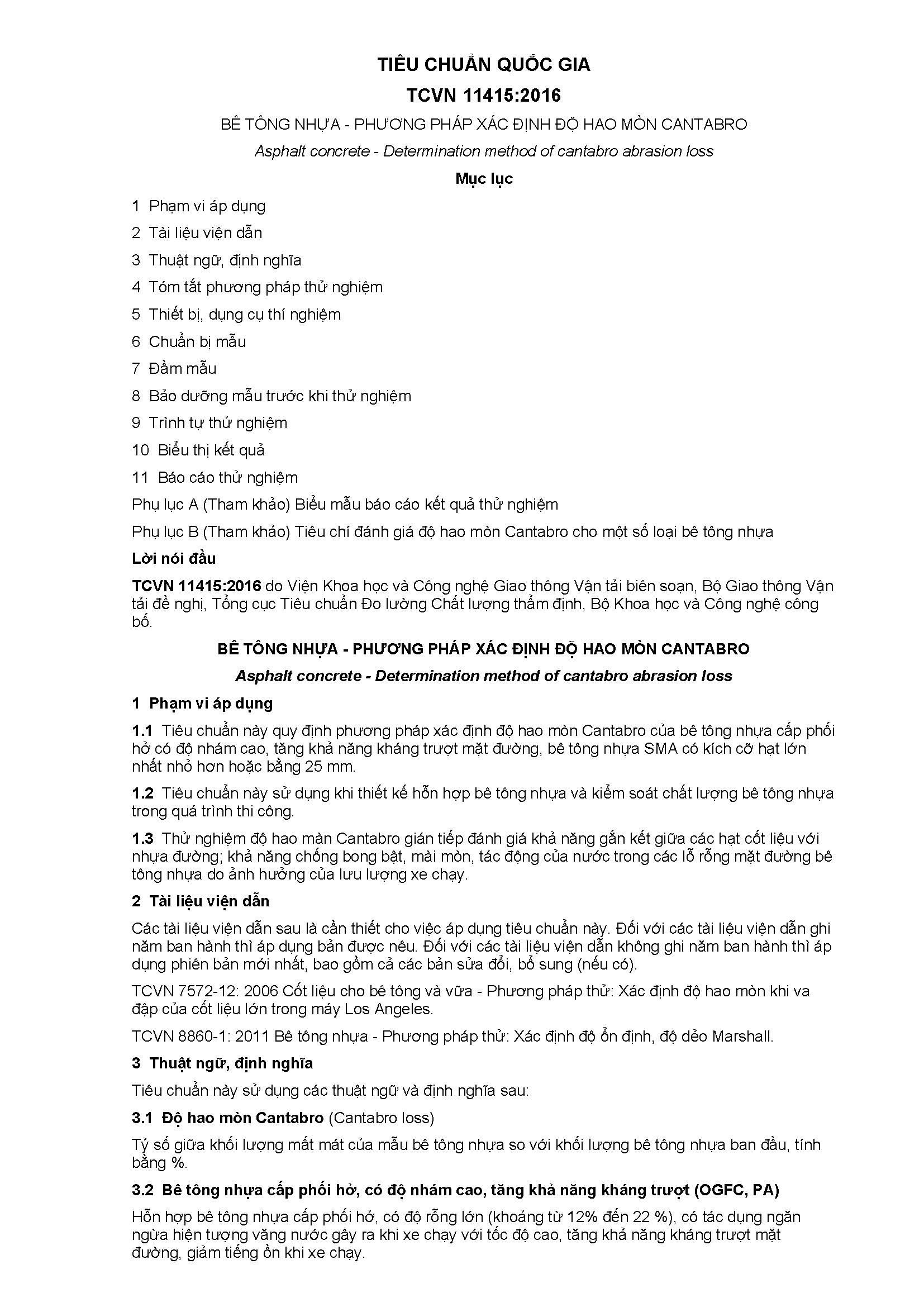Tiêu chuẩn quốc gia TCVN 11415:2016 về Bê tông nhựa - Phương pháp xác định độ hao mòn cantabro