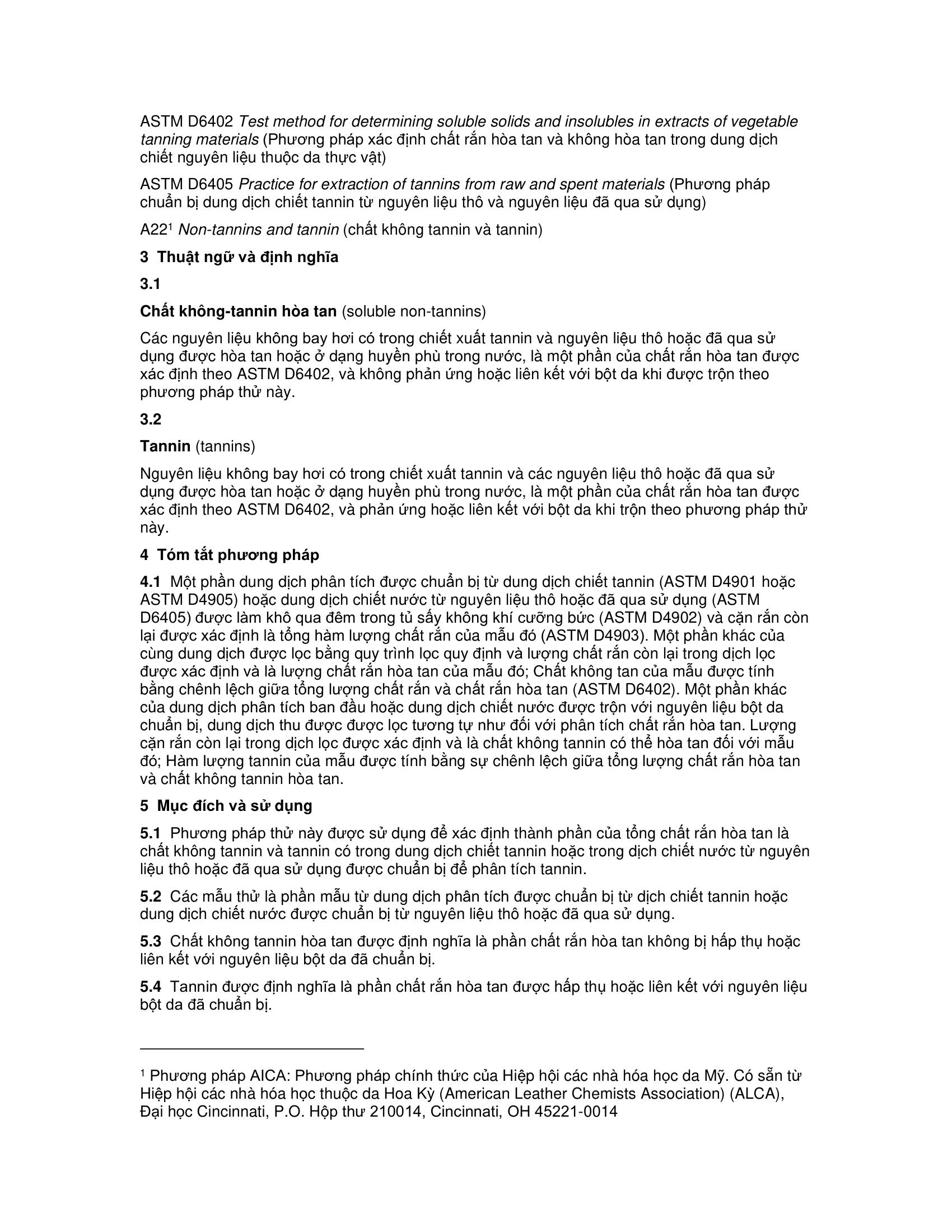 ASTM D4903 Test method for total solids and water in vegetable tanning material extracts (Phương pháp xác định tổng lượng chất rắn và nước trong dung dịch chiết nguyên liệu thuộc da thực vật)