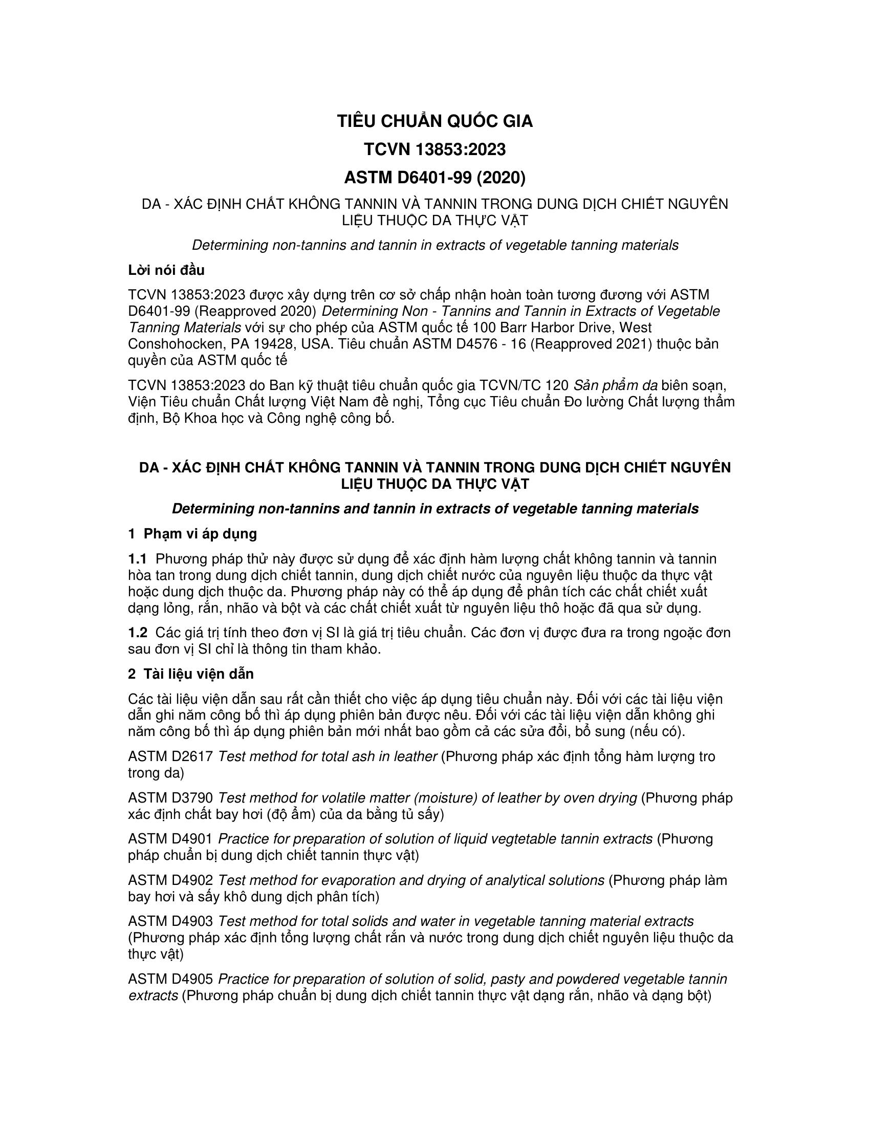 TCVN 13853:2023 được xây dựng trên cơ sở chấp nhận hoàn toàn tương đương với ASTM D6401-99 (Reapproved 2020) Determining Non - Tannins and Tannin in Extracts of Vegetable Tanning Materials với sự cho phép của ASTM quốc tế 100 Barr Harbor Drive, West Conshohocken, PA 19428, USA. Tiêu chuẩn ASTM D4576 - 16 (Reapproved 2021) thuộc bản quyền của ASTM quốc tế